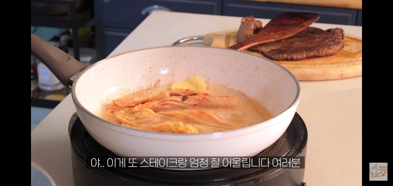 스테이크 맛있게 굽는 법에 정말 잘 어울리는 한국식 가니쉬를 만들어보겠습니다. 불을 약불로 줄이고, 맛있는 소기름이 남아있는 팬에 버터 한 스푼을 넣어 녹인 뒤 물에 헹군 김치를 구워주세요. 정말 잘 어울립니다! 김치를 좋아하신다면 많이 만들어도 괜찮습니다.