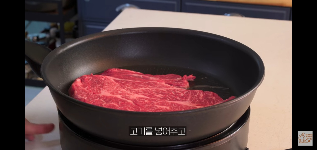 식용유를 넉넉히 두르고, 뜨겁게 달군 팬을 강불로 유지한 채 고기를 올려주세요. 기름이 튈 수 있지만, 불을 줄이면 미디움레어 스테이크를 즐기기 어렵습니다! 강불로 계속 구워주시면 됩니다.