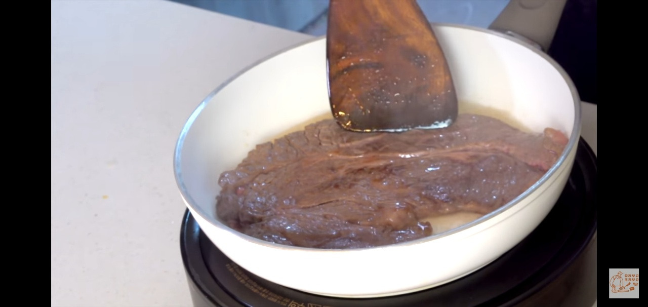 뜨겁게 달군 팬에 고기를 올려 밑부분이 갈색빛이 돌고 거의 익으면 스테이크를 한 번 뒤집어 주세요.