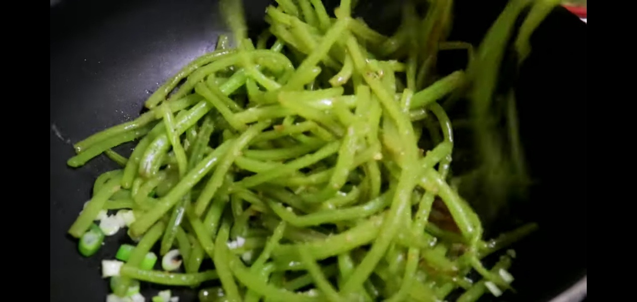 마늘과 대파의 향이 올라오고 대파가 어느 정도 익으면, 양념해 둔 고구마줄기를 넣어 주세요.
