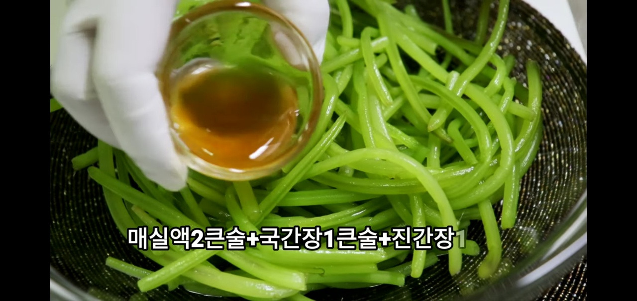 이후 매실액 2스푼, 국간장 1스푼, 진간장 1스푼 반을 넣어 고구마줄기볶음에 달달한 맛과 감칠맛을 더해 주세요.