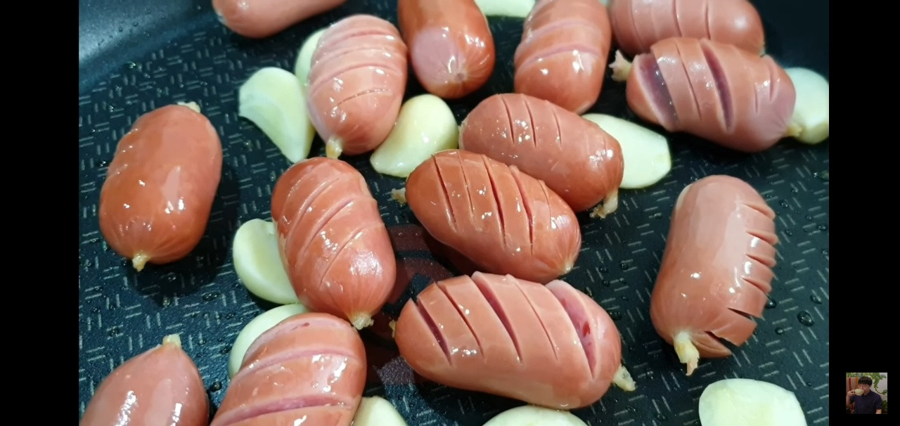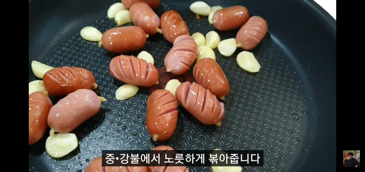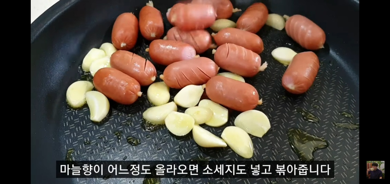 마늘에서 고소한 향이 올라오면 소시지를 넣고 함께 볶아 주세요.