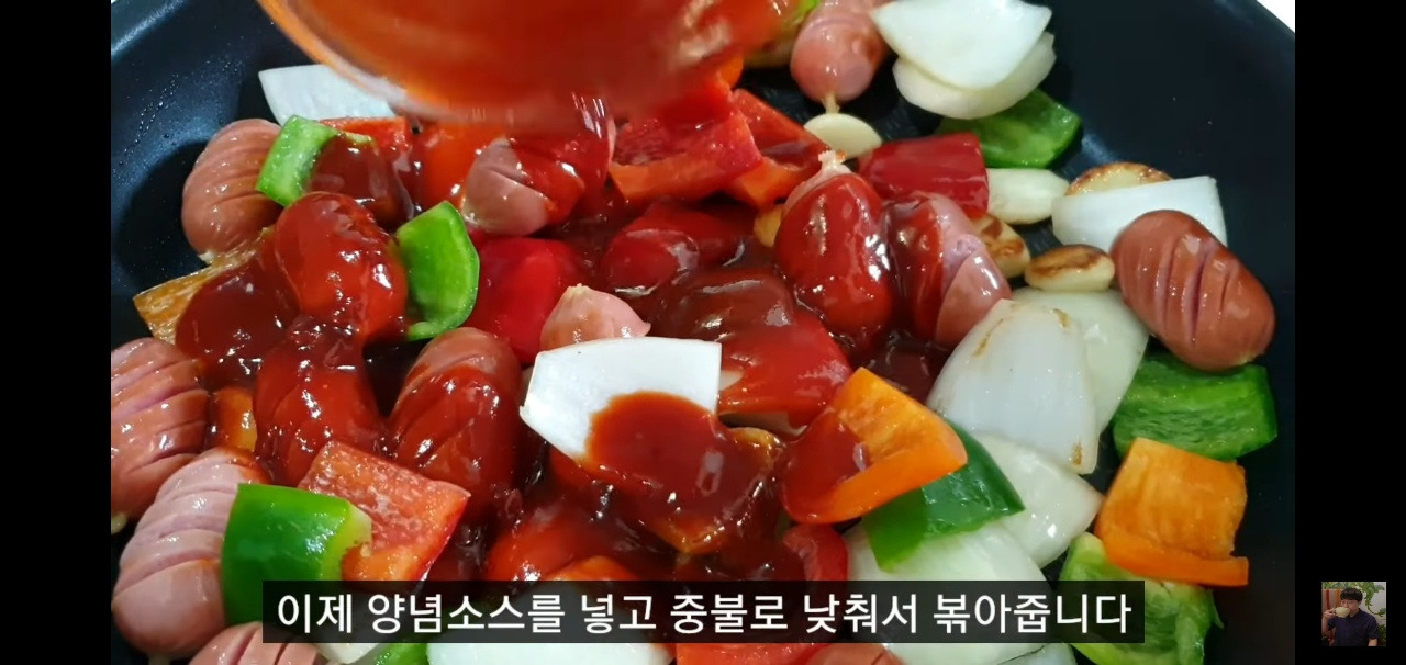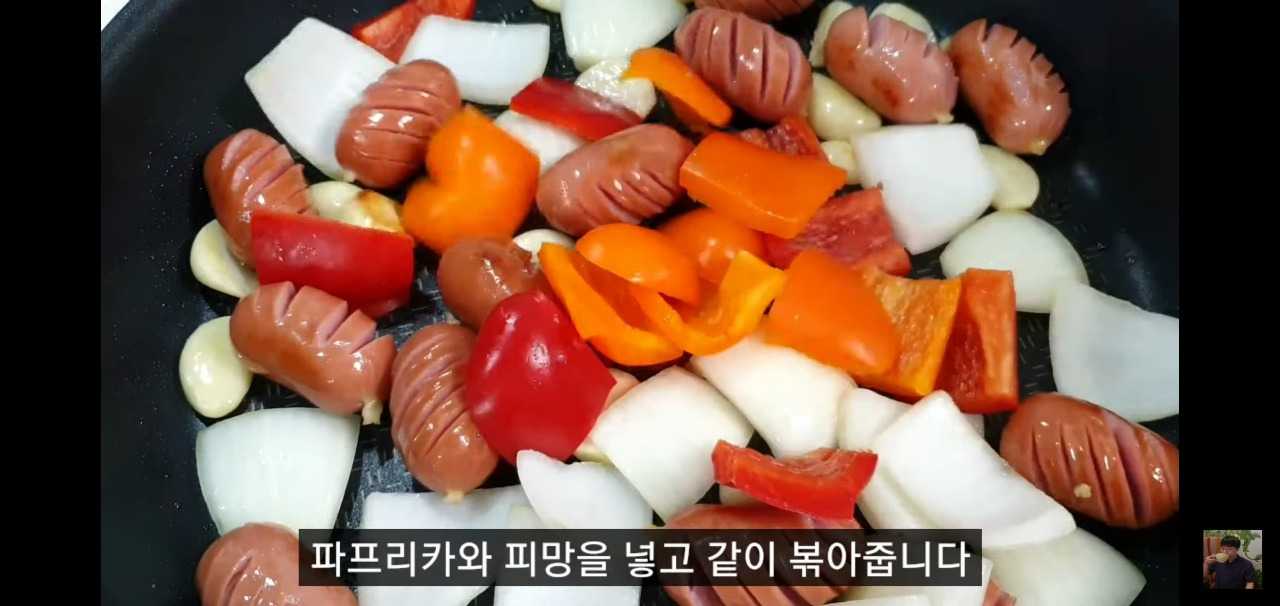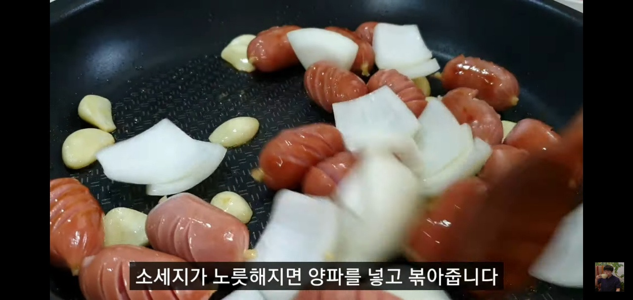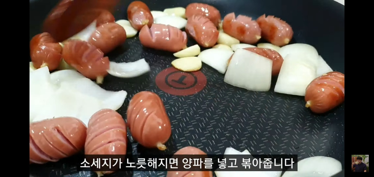 중간불에서 소시지를 노릇하게 볶다가, 소시지가 어느 정도 익으면 양파를 넣고 함께 볶아 주세요.