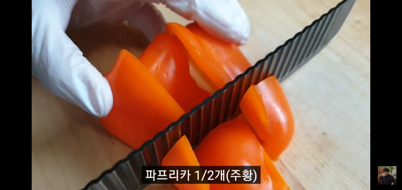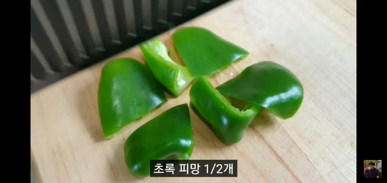 소시지 야채볶음에 달콤한 맛과 먹음직스러운 색감을 더해 줄 피망과 파프리카 반 개도 먹기 좋은 크기로 썰어 주시면 됩니다.