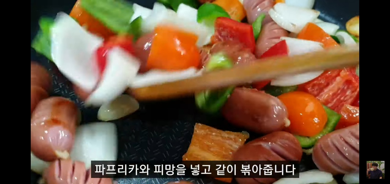 파프리카도 이때 함께 넣어 주시면 됩니다. 모든 재료를 넣고 약 2분 정도 볶아 주세요.