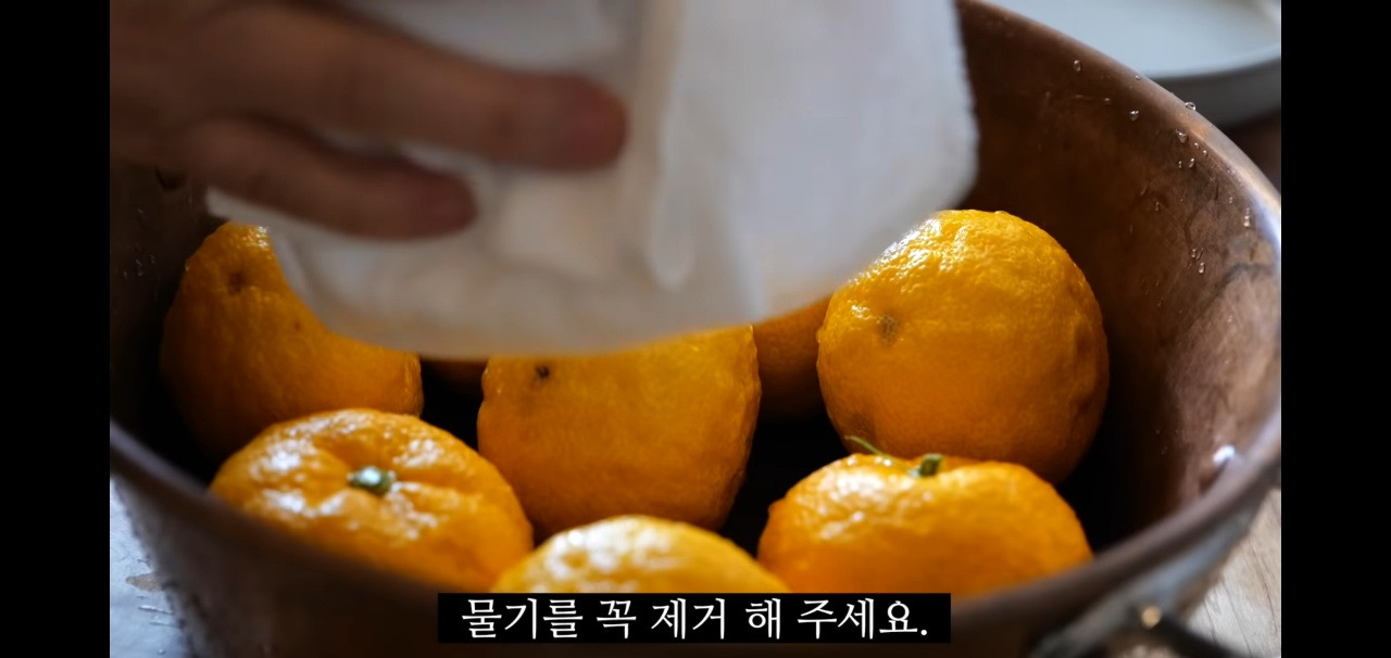 깨끗이 닦은 후에 껍질의 물기를 잘 제거해주시면 유자청 만들기에서 유자 세척이 완료됩니다!