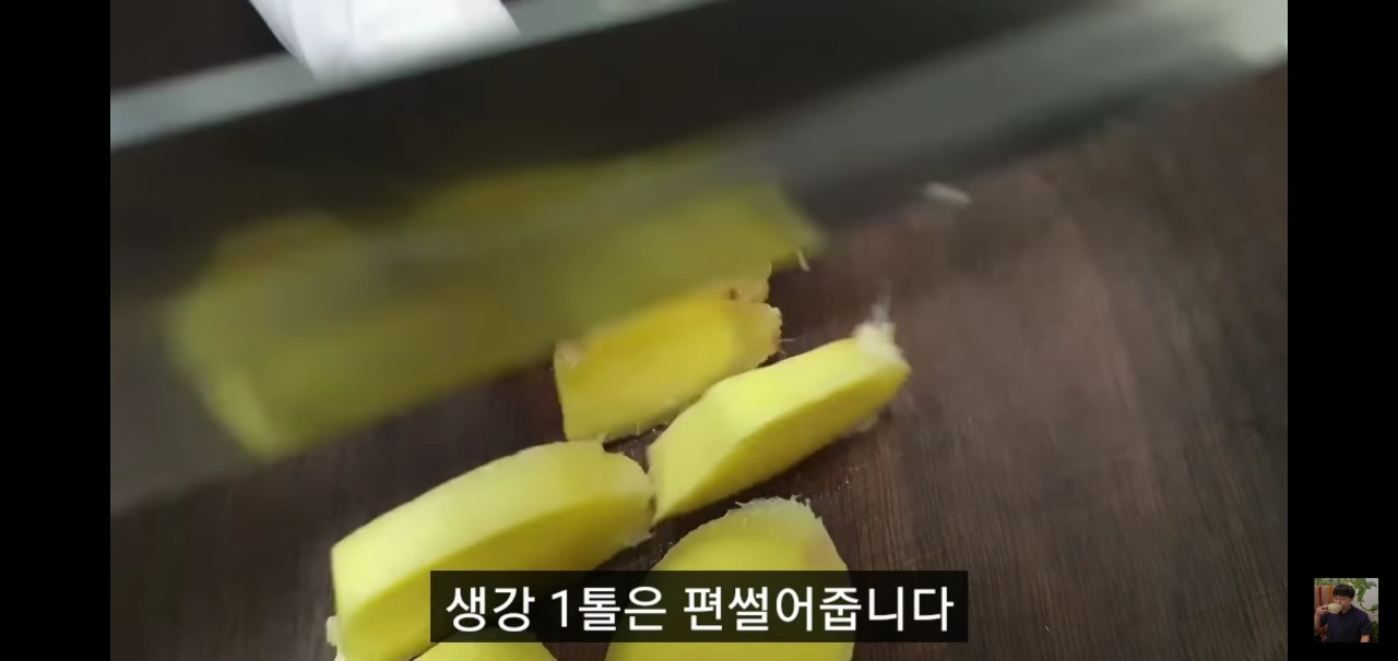 생강 한 톨을 편으로 썰어주면, 이제 돼지갈비찜을 맛있게 만드는 준비가 모두 끝납니다!