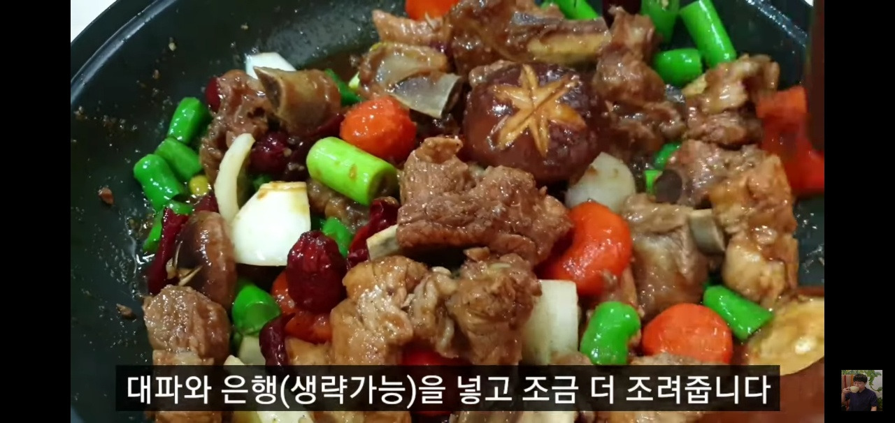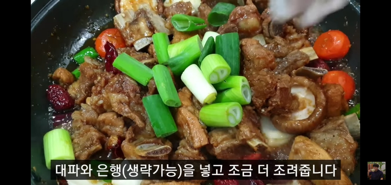 이제 불을 중불로 낮추고 돼지갈비찜에 양념이 잘 배도록 뒤적여 주세요. 국물이 거의 다 졸아들면 대파를 넣고 조려주면 됩니다. 이렇게 하면 오늘의 돼지갈비찜 맛있게 만드는 법이 완성됩니다!