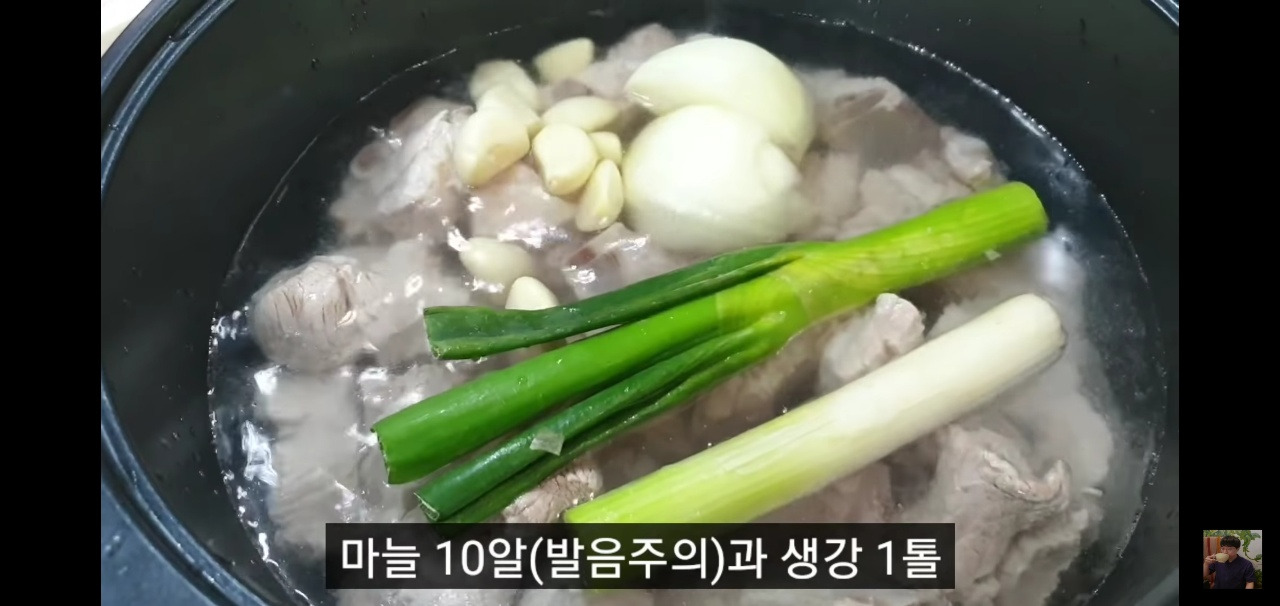 마늘 10알과 생강 한 톨, 청양고추도 함께 넣어 돼지갈비찜 육수를 우려내 주세요.