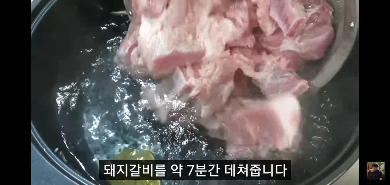 7분간 데친 돼지갈비는 찬물에 잘 헹궈서 핏물과 이물질을 깨끗하게 씻어준 뒤, 채에 받쳐 물기를 빼주세요.