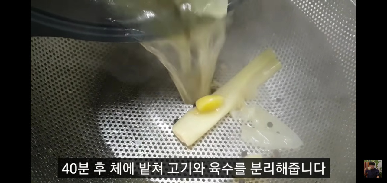 40분간 삶은 고기와 육수는 채에 받쳐 고기와 육수를 분리해 주세요.