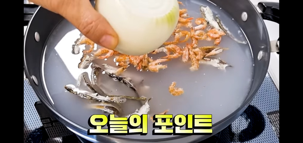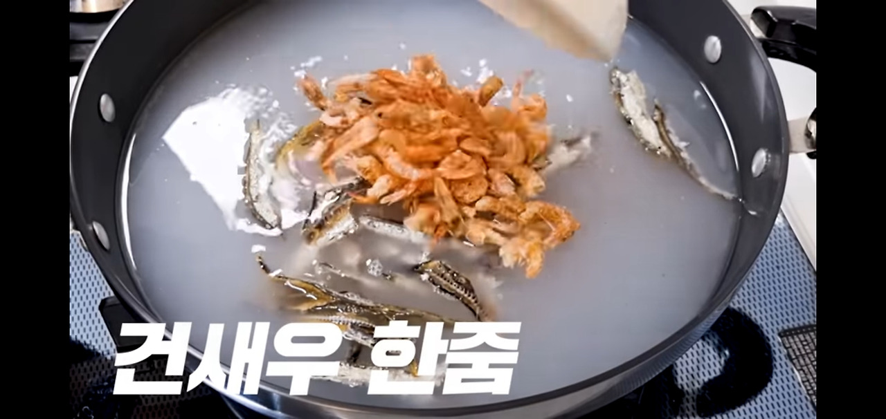 멸치 한 줌과 건새우 한 줌을 함께 넣어 끓여주세요.