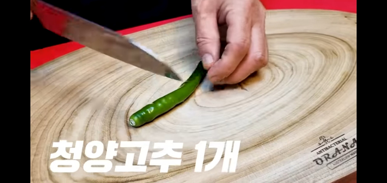 청양고추 한 개와 홍고추 한 개를 작게 썰어주세요.