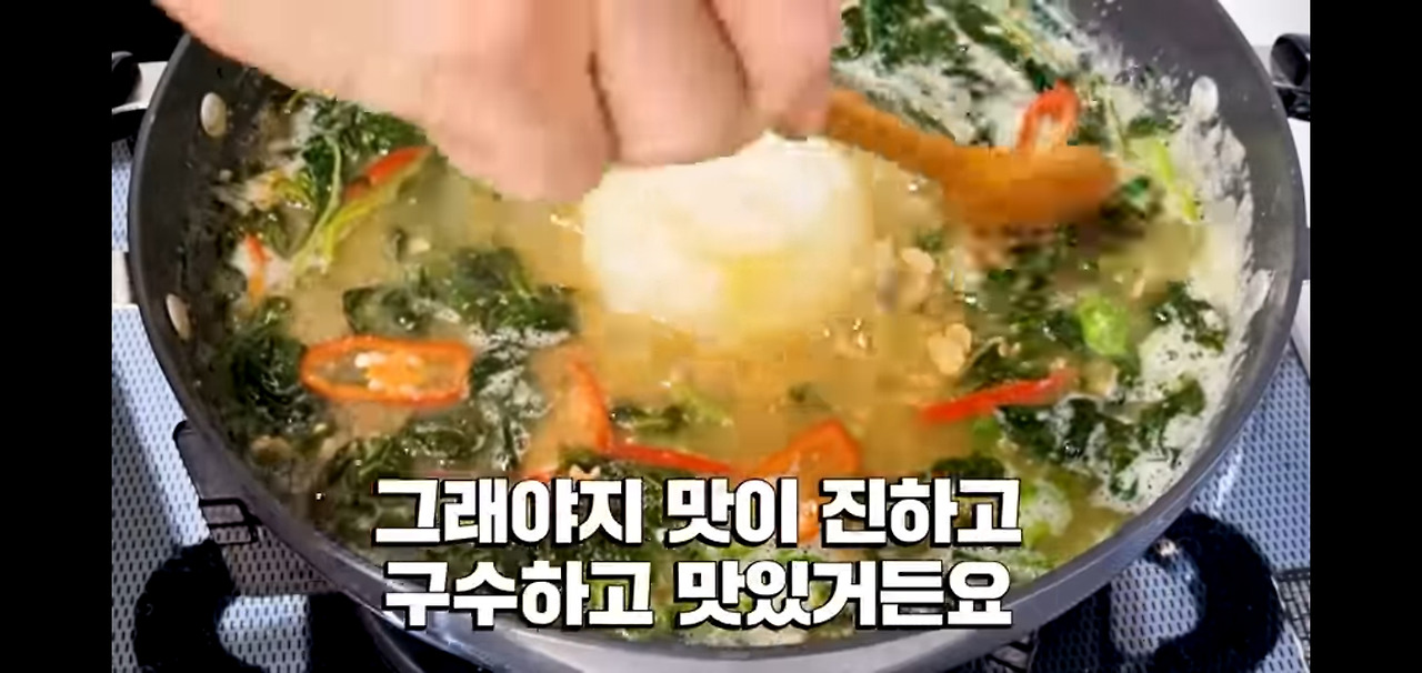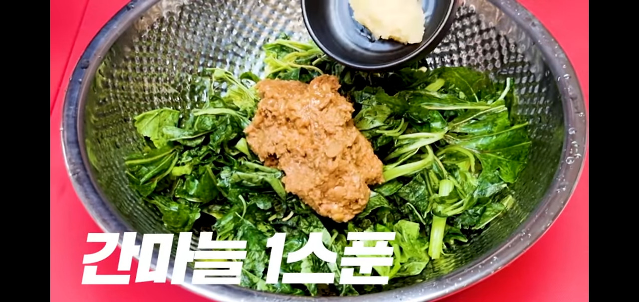 된장 4스푼과 간마늘 1스푼을 넣어 아욱에 맛이 잘 배도록 잠시 숙성시켜 주세요!