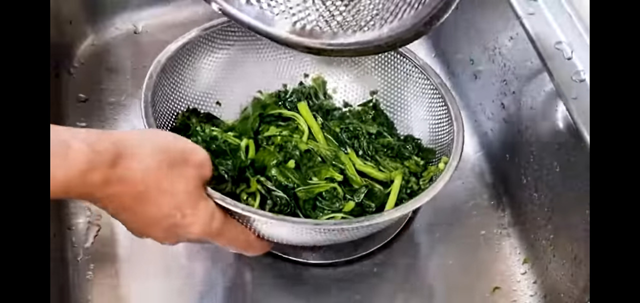 이렇게 깔끔하게 씻은 아욱은 채에 받쳐주세요.