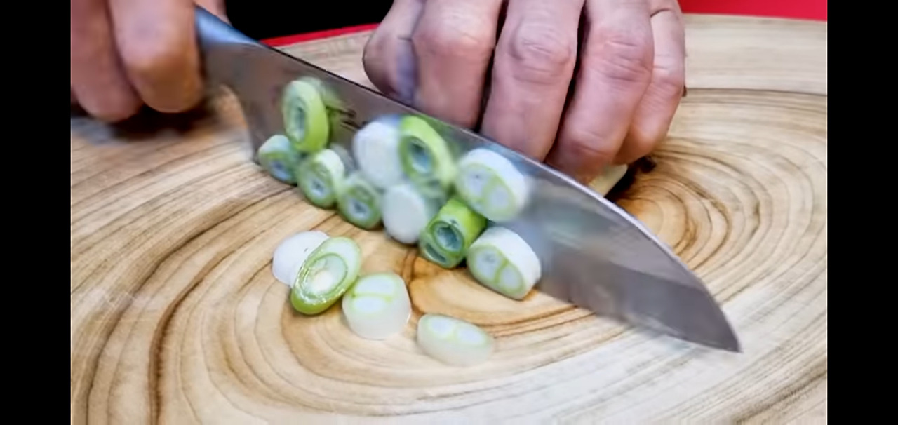 대파 한 대도 작게 썰어주시고, 통양파 한 개는 밑부분에 벌집 모양으로 칼집을 내주세요.