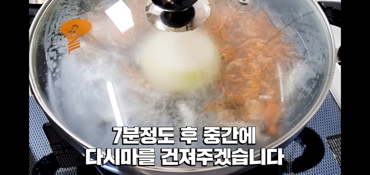 뚜껑을 덮고 7분간 끓인 뒤 다시마를 건져내 주세요.