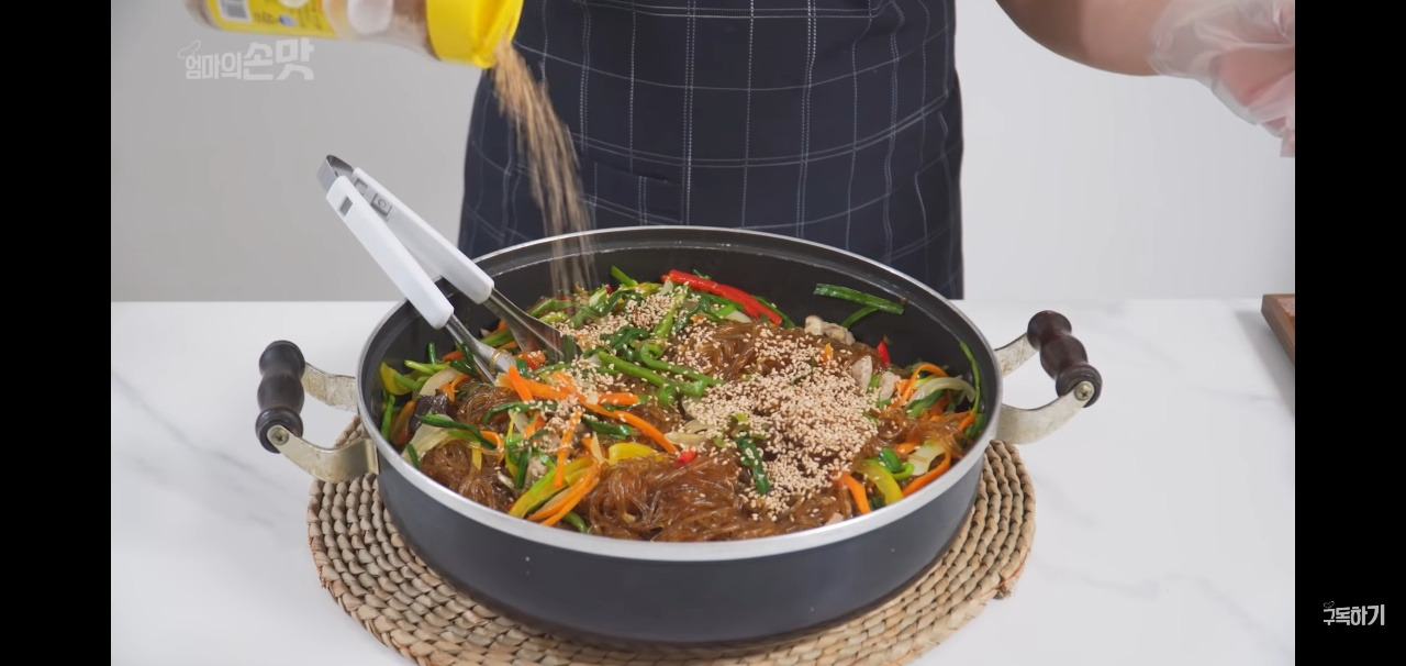 마지막으로 통깨를 듬뿍 넣어 함께 섞어주면 더욱 고소하고 맛있는 잡채를 즐기실 수 있습니다!