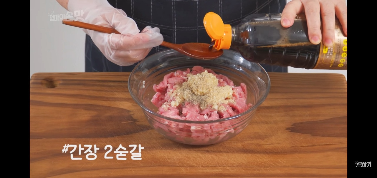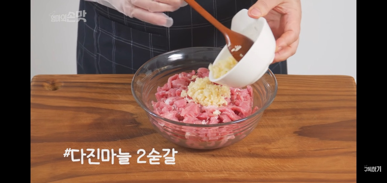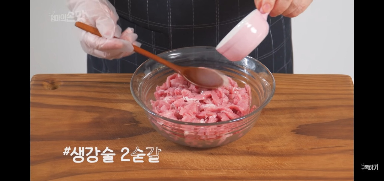 고기에 생강술 두 스푼과 다진 마늘 두 스푼을 넣어주세요.