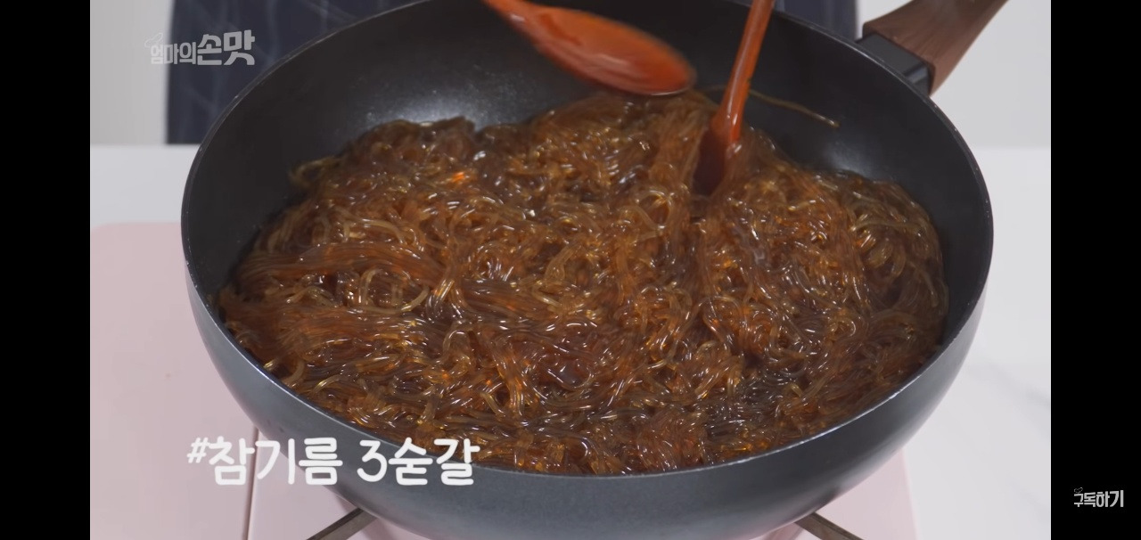 마지막에 불을 끄고 참기름 세 스푼을 넣어 섞어주면 당면이 잘 불지 않아 좋습니다!