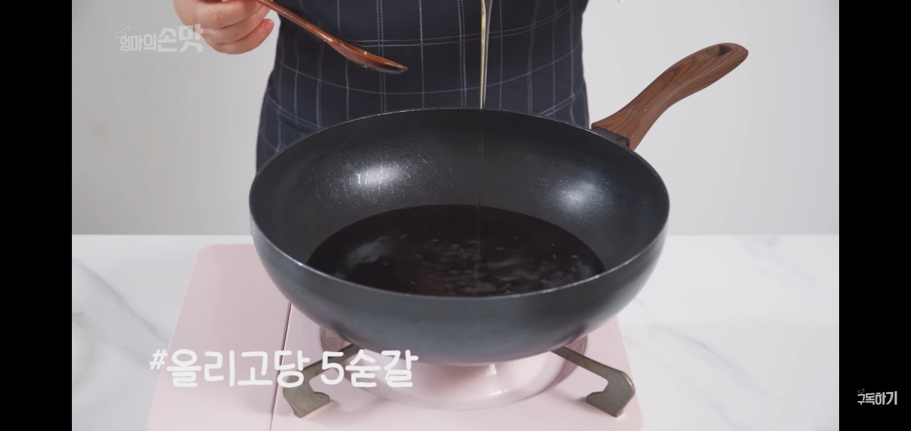 잡채에 들어갈 야채들을 미리 볶아주세요. 팬에 식용유 두 스푼을 넣고 강불로 달궈주세요.