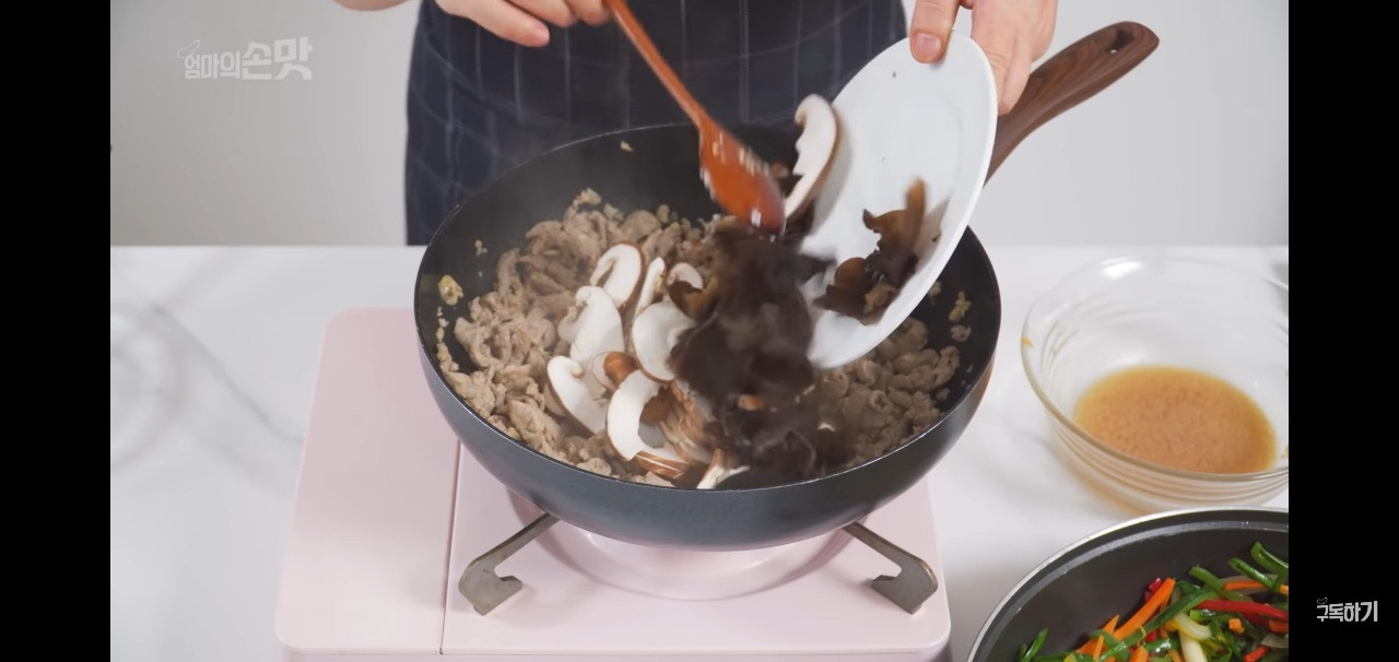 고기가 어느 정도 익으면 썰어둔 목이버섯과 표고버섯을 넣어주세요. 버섯들이 부드럽게 익으면 팬에서 내려 한 김 식혀주시면 됩니다!