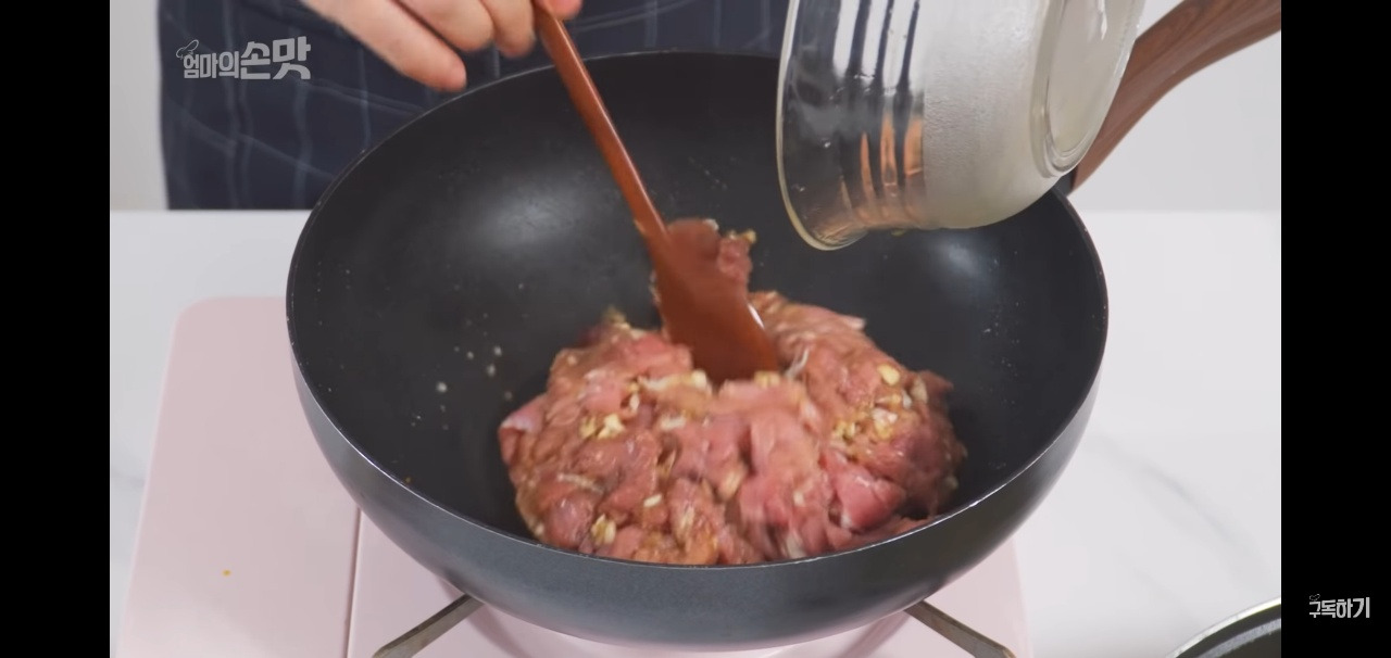 이제 잡채에 들어갈 고기를 볶아줄 차례입니다. 밑간해둔 고기를 기름을 두르지 않은 상태에서 강불로 달군 팬에 바로 넣어 볶아주세요.