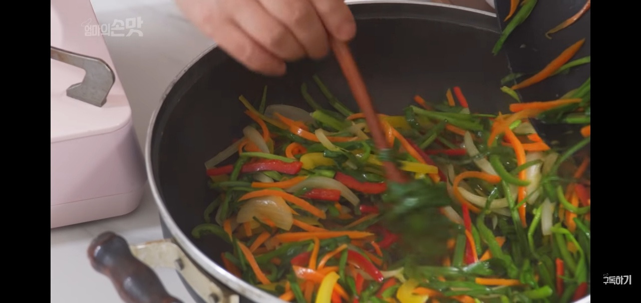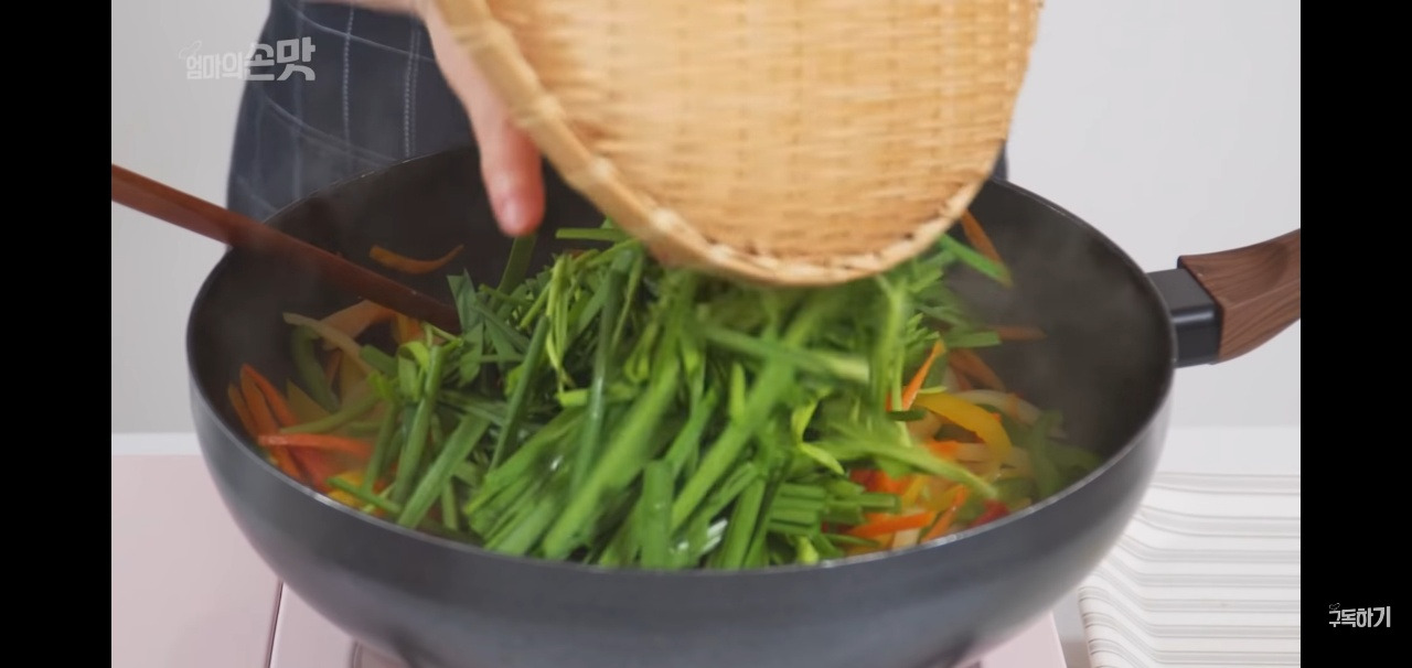 야채들이 어느 정도 익으면 마지막으로 부추를 넣고 불을 끈 뒤, 잔열로 야채들을 섞어가며 익혀주세요. 이렇게 볶은 야채들은 따로 덜어내 한 김 식혀주시면 됩니다.