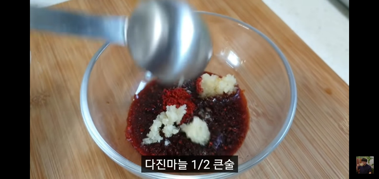 그리고 고추가루 1스푼과 다진 마늘 반 스푼을 넣어 주세요.