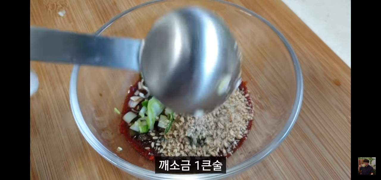 그리고 맛있는 깨소금과 참기름을 각각 1스푼씩 넣어 주시면 됩니다.