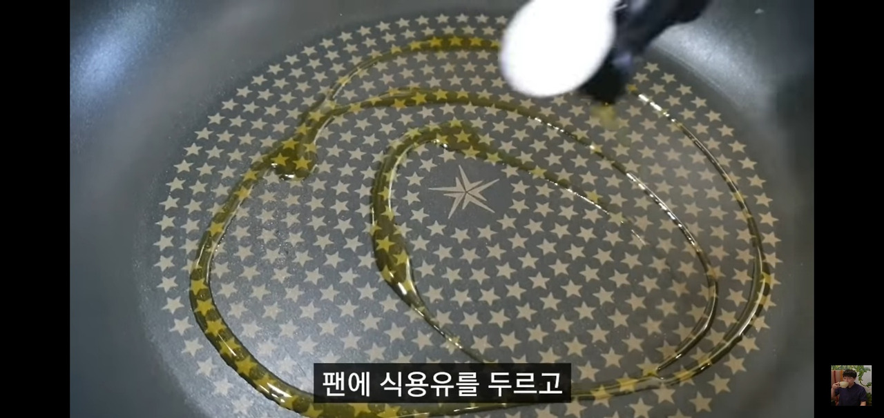 이제 잔치국수의 고명으로 올릴 애호박을 볶아 보겠습니다. 팬에 식용유를 두르세요.
