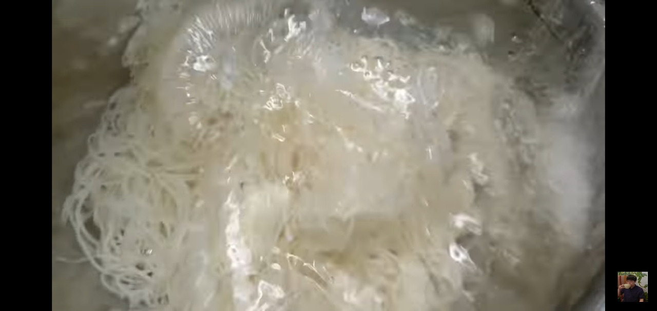 끓는 물에 소면 2인분을 삶아 주세요. 물이 끓어오르면 찬물을 부어 주세요. 이렇게 하면 국수 면발이 더욱 탱탱해져 맛있습니다! 이 과정을 두 번 반복해 주세요.