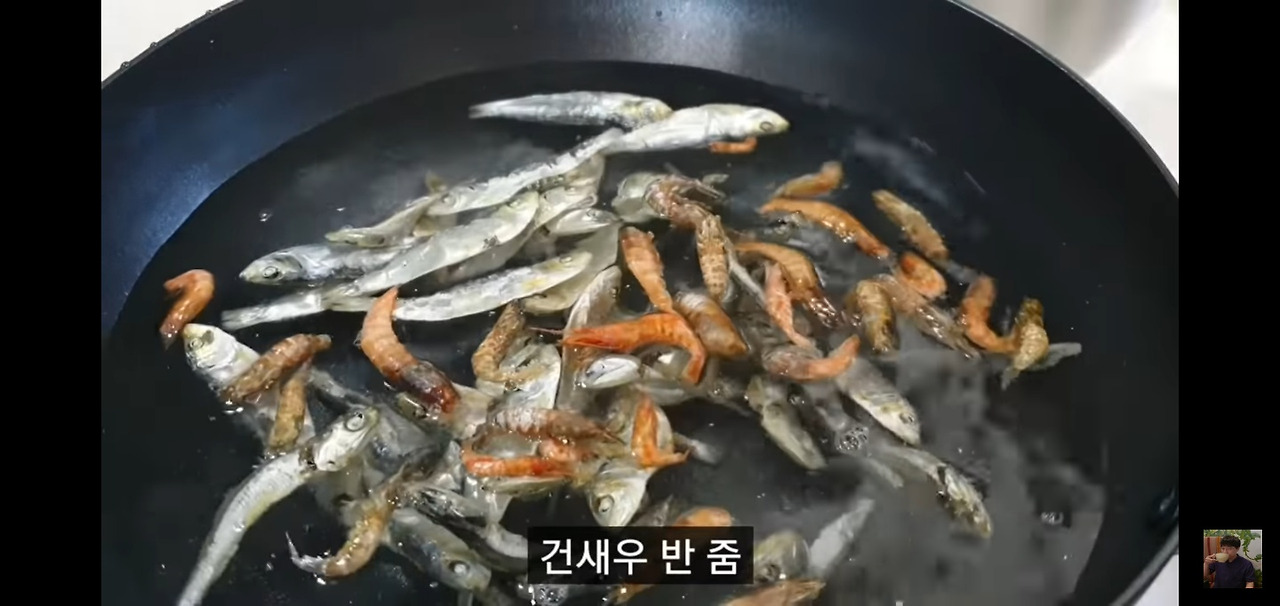 이제 잔치국수에 사용할 육수를 만들어 보겠습니다. 멸치 반 줌과 디포리 반 줌을 넣어 주세요. 디포리가 없다면 멸치를 한 줌 넣으셔도 괜찮습니다.