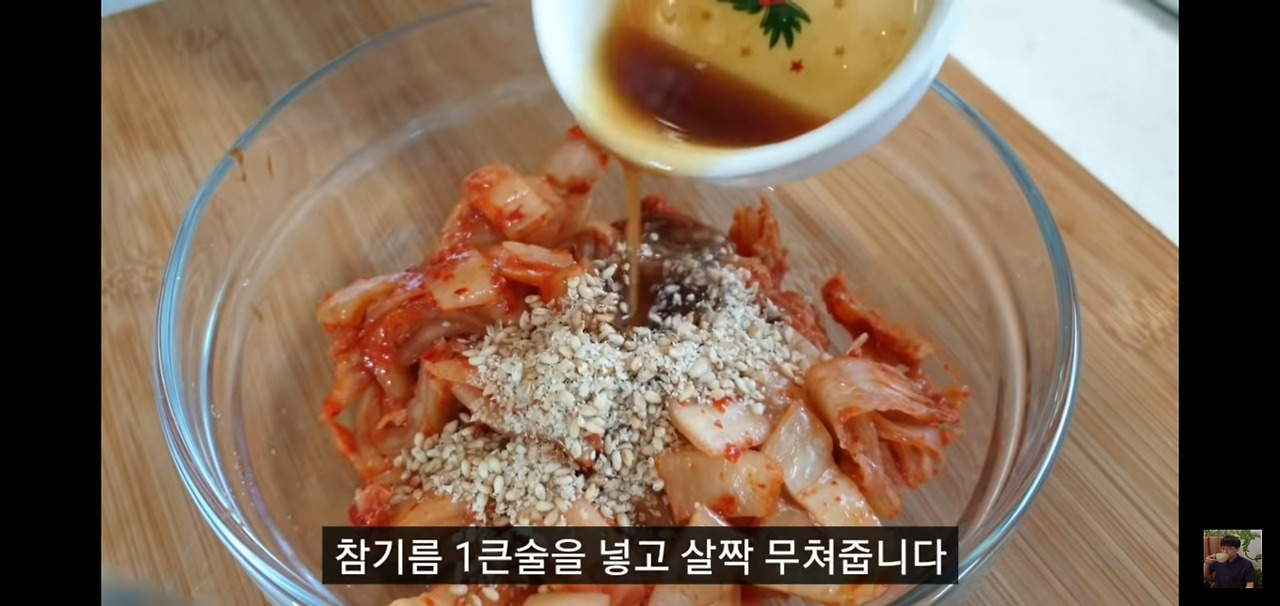 썰어 둔 신김치에 참기름 1스푼과 깨소금 1스푼을 넣고 살짝 무쳐 주시면 김치가 훨씬 맛있어집니다!