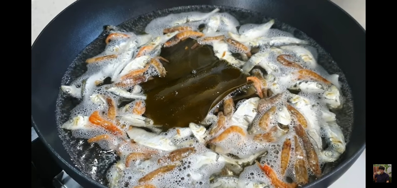 그리고 잔치국수 육수에 감칠맛을 확 끌어올려줄 건새우 반 줌과 다시마 2장을 넣고 함께 끓여 주세요.