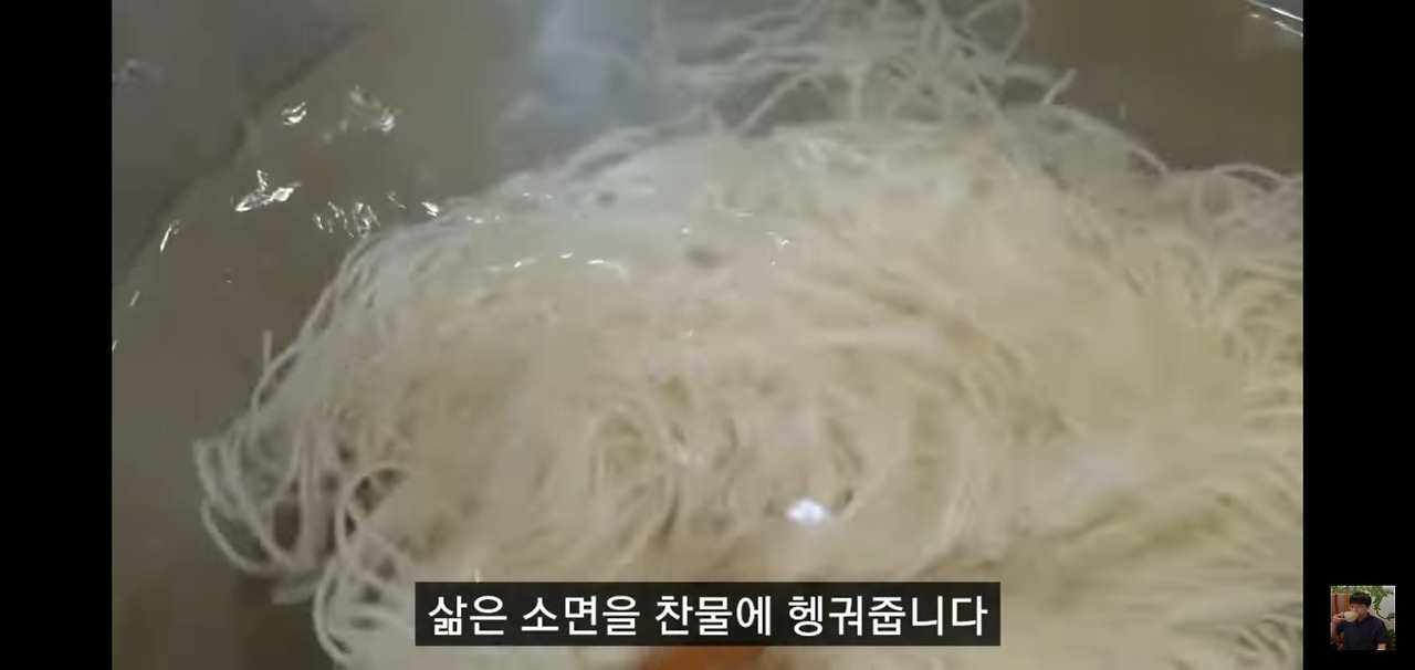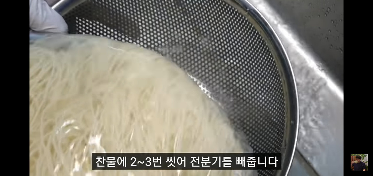잘 삶아진 소면은 찬물에 두세 번 헹군 후 채에 받쳐 물기를 빼 주세요.