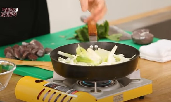 ▶ 먼저 양파를 넣고 볶다가, 양배추와 대파도 함께 넣어 볶아줍니다.