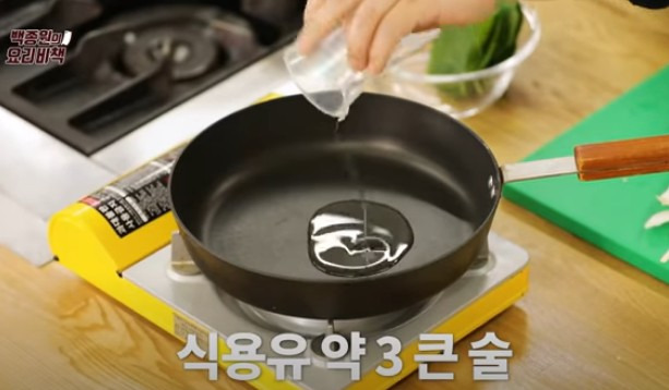 ▶ 팬에 식용유 3큰술 정도 넣고 불을 켠 뒤, 팬을 살짝 데워주세요.