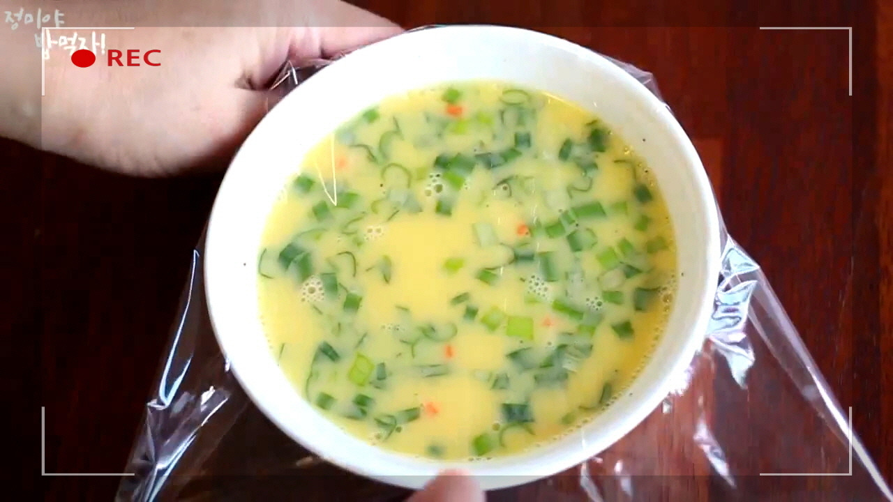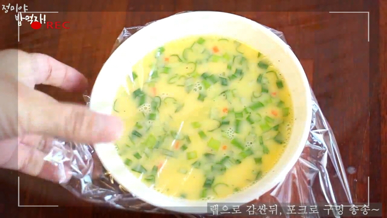 섞어둔 계란물 위를 랩으로 덮은 뒤, 작은 구멍을 몇 군데 뚫어주세요. 그런 다음 전자레인지에 약 4분 정도 돌려주시면, 오늘의 전자레인지 계란찜이 완성됩니다.