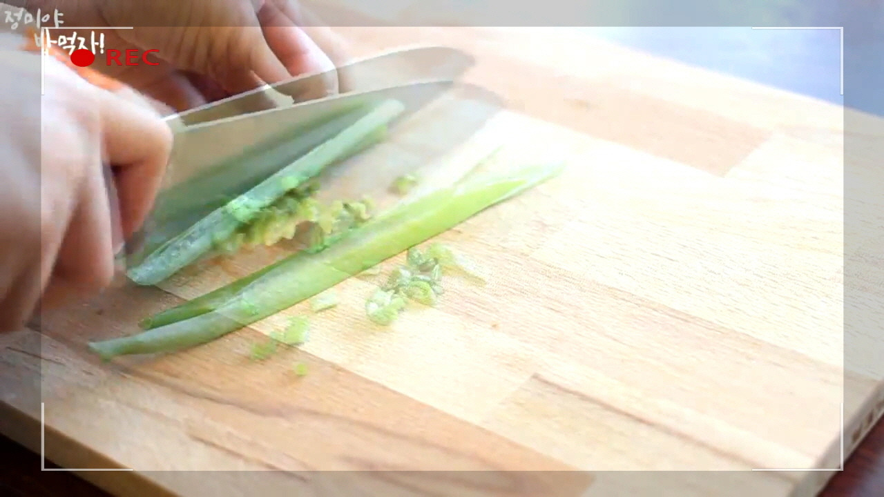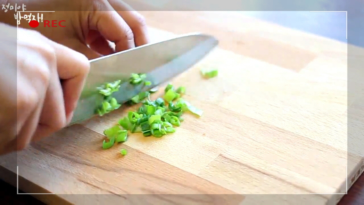 대파도 잘게 썰어 준비해 주세요. 대파는 은은한 향을 더해줄 뿐만 아니라 계란찜의 비주얼을 한층 살려주어 깔끔한 맛을 완성해 줍니다.