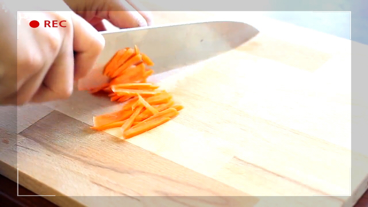 먼저 당근을 잘게 다져 준비해 주세요. 당근은 계란찜에 화사한 색감을 더해줄 뿐 아니라 아삭한 식감과 은은한 단맛으로 요리의 완성도를 한층 높여줍니다.