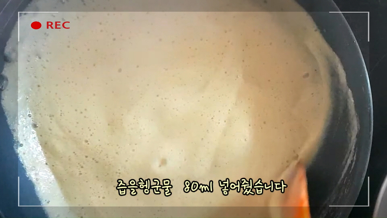 떡볶이 황금레시피에서 이제 즙을 끓이는 단계입니다. 냄비에 준비해 둔 갈은 즙 80ml를 넣어주세요.