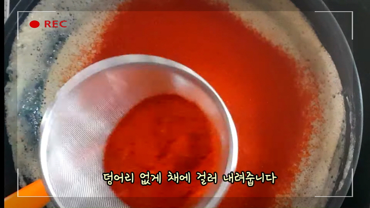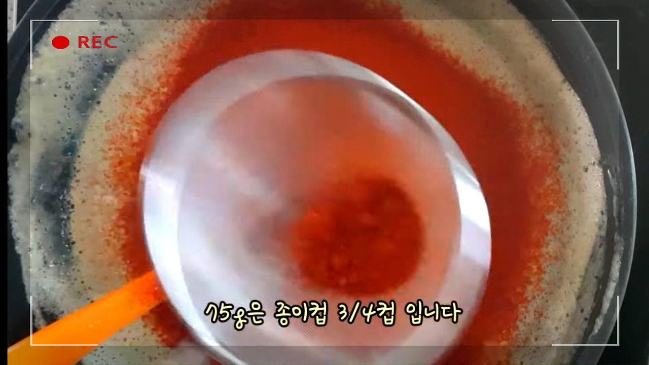 고운 고춧가루 3/4컵을 준비해 덩어리가 생기지 않도록 체에 걸러 넣어주세요.