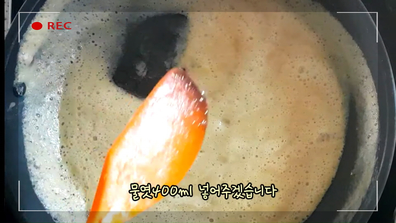 양파와 마늘의 강한 향이 사라지면 불을 끄고, 물엿 400ml를 넣어주세요. 이렇게 하면 떡볶이 소스에 은은한 달콤함이 더해집니다.