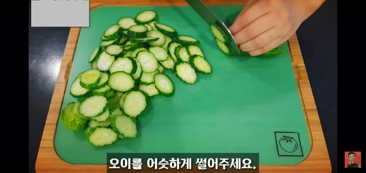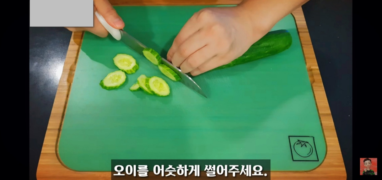 오이는 드시기 좋은 크기로 어슷썰기 해서 준비해 주세요.
