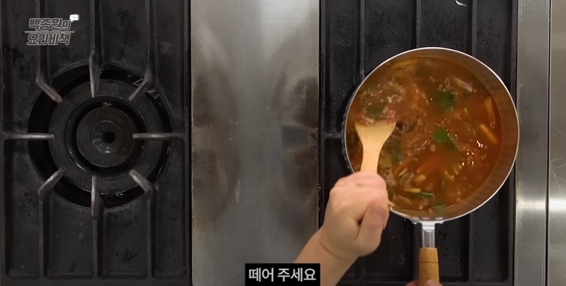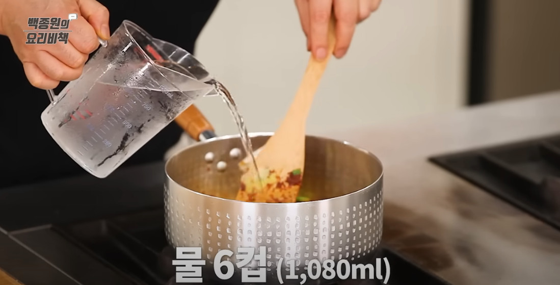 4. 고추기름이 충분히 나오면 물을 넣어주세요. 이때 볶는 과정에서 고기가 냄비 바닥에 붙어 있을 수 있으니, 주걱으로 잘 긁어 떼어주어야 합니다. 밑에 붙은 고기를 그대로 두면 조리 중에 타버릴 수 있기 때문입니다.