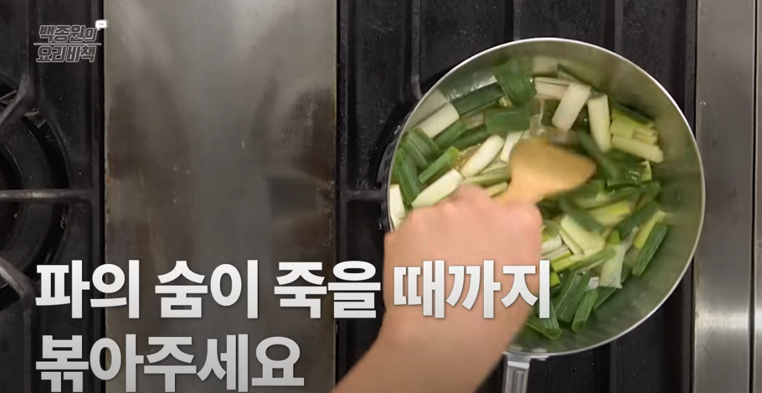 1. 냄비에 참기름과 식용유를 분량대로 넣고, 대파를 먼저 넣어 숨이 죽을 때까지 볶아줍니다.