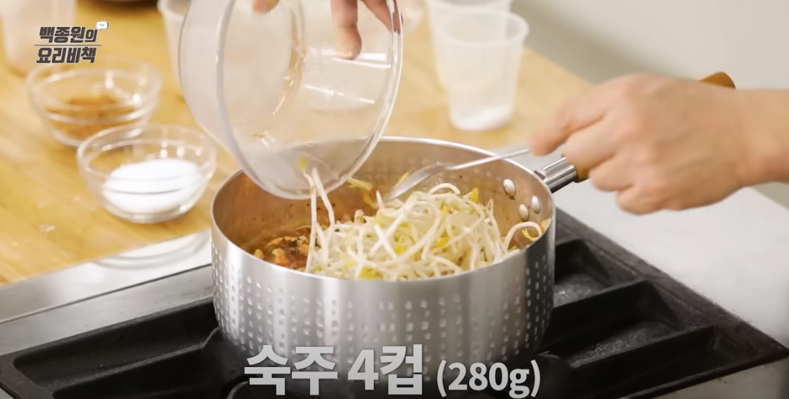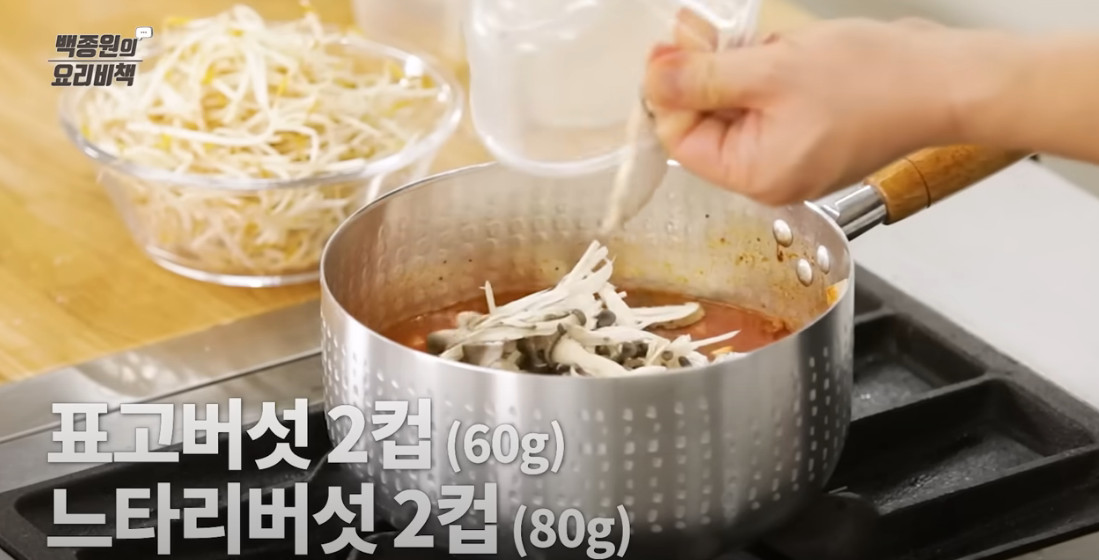 7. 물이 끓어오르면 숙주를 넣습니다. 사실 숙주는 넣어도 되고 생략해도 상관없습니다. 이 단계에서는 간을 확인할 필요가 없으며, 간은 숙주가 숨이 죽고 버섯에서 수분이 나오며 모든 재료가 어우러진 후에 맞추시면 됩니다. 또한, 준비된 달걀은 미리 풀어서 준비해 주세요.