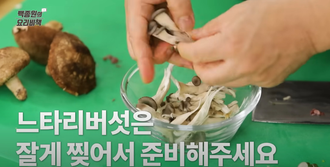 2. 고기는 한 입 크기로 썰고, 느타리버섯은 잘게 찢어 준비합니다. 표고버섯은 갓과 심을 분리하여 따로 썰어주세요. 또한 당면은 물에 약 30분 정도 불려둡니다.