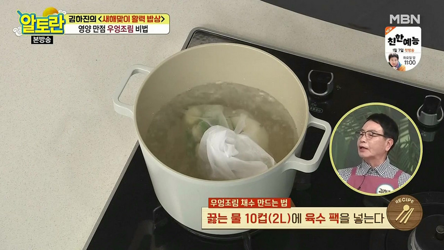 6. 냄비에 물 10컵(약 2L)을 붓고 센 불에서 끓여주세요. 물이 끓어오르면 준비한 육수팩을 넣고, 센 불에서 약 40분간 끓여 물이 절반가량 줄어들면 육수팩을 건져내 주세요. 이렇게 만든 채수를 사용하면 우엉조림의 맛과 풍미가 한층 살아난다고 합니다.